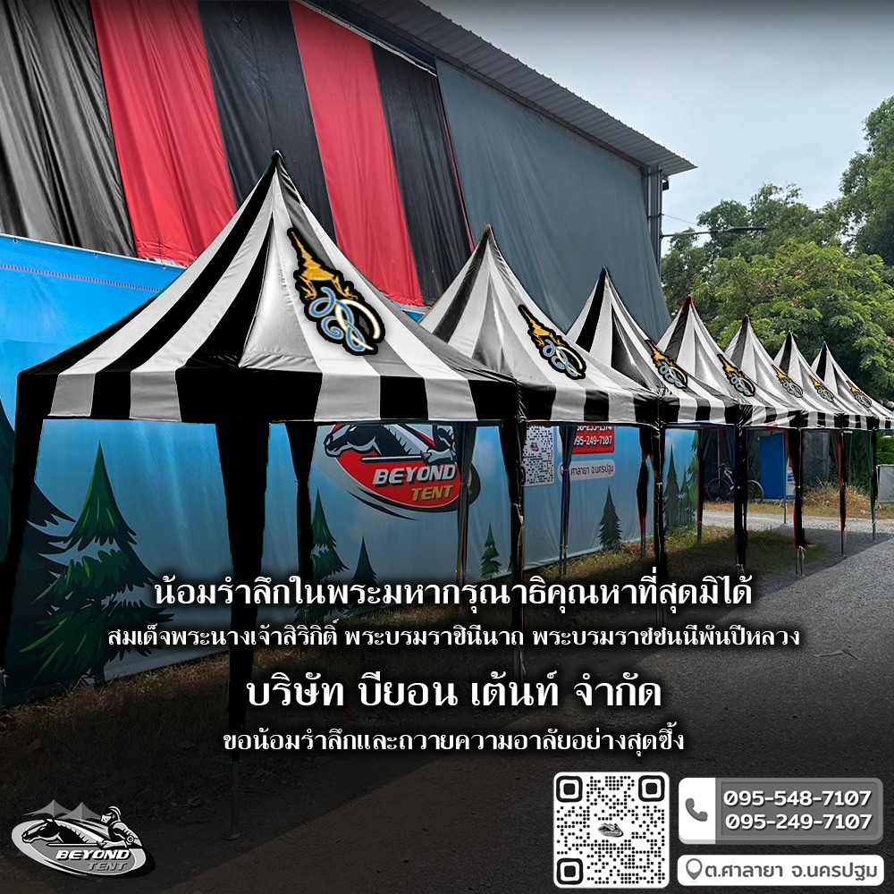 เต็นท์ผ้าใบ Beyond Tent บริการผลิตและจำหน่ายเต็นท์พับ, เต็นท์ผ้าใบ, บริการสกรีนโลโก้เต็นท์ผ้าใบ, สกรีนแบรนด์หน่วยงานบนเต็นท์, รับสกรีนโลโก้เต็นท์ ทุกขนาดโดยช่างที่มีประสบการณ์เพียงท่านส่งรูปแบบของโลโก้มาให้เราประเมินราคาให้ และท่านสามารถมั่นใจได้เลยว่าท่านจะได้เต็นท์พร้อมสกรีนโลโก้ที่ได้มาตรฐานสวยงามและราคาย่อมเยา เต็นท์อย่างดีมีคุณภาพสินค้าจากโรงงานราคาถูกมีหลากหลายรูปแบบให้ท่านเลือก เช่น เต็นท์ขายของ เต็นท์พับได้ เต็นท์ตลาดนัด มีหลายขนาดให้เลือกใช้งาน ลูกค้าสามารถเลือกขนาดและสีได้ตามความต้องการ รวมทั้งรับงานสกรีนผ้าใบ สกรีนโลโก้ และรับทำผ้าใบตามแบบ โครงเหล็กเต็นท์ และรับทำเต็นท์ผ้าใบตามแบบที่ลูกค้าต้องการโดยทีมงานมืออาชีพ จึงมั่นใจได้ว่าท่านจะได้เต็นท์ผ้าใบที่ดีมีคุณภาพและเพื่อให้ตรงกับความต้องการของลูกค้า ทางเราได้ทำเต็นท์ตามรูปทรงเต็นท์มาตราฐานต่าง ๆ หลายแบบ อาทิ เช่น