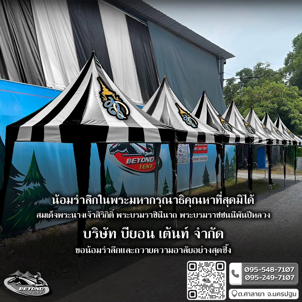 เต็นท์ผ้าใบ Beyond Tent บริการผลิตและจำหน่ายเต็นท์พับ, เต็นท์ผ้าใบ, บริการสกรีนโลโก้เต็นท์ผ้าใบ, สกรีนแบรนด์หน่วยงานบนเต็นท์, รับสกรีนโลโก้เต็นท์ ทุกขนาดโดยช่างที่มีประสบการณ์เพียงท่านส่งรูปแบบของโลโก้มาให้เราประเมินราคาให้ และท่านสามารถมั่นใจได้เลยว่าท่านจะได้เต็นท์พร้อมสกรีนโลโก้ที่ได้มาตรฐานสวยงามและราคาย่อมเยา เต็นท์อย่างดีมีคุณภาพสินค้าจากโรงงานราคาถูกมีหลากหลายรูปแบบให้ท่านเลือก เช่น เต็นท์ขายของ เต็นท์พับได้ เต็นท์ตลาดนัด มีหลายขนาดให้เลือกใช้งาน ลูกค้าสามารถเลือกขนาดและสีได้ตามความต้องการ รวมทั้งรับงานสกรีนผ้าใบ สกรีนโลโก้ และรับทำผ้าใบตามแบบ โครงเหล็กเต็นท์ และรับทำเต็นท์ผ้าใบตามแบบที่ลูกค้าต้องการโดยทีมงานมืออาชีพ จึงมั่นใจได้ว่าท่านจะได้เต็นท์ผ้าใบที่ดีมีคุณภาพและเพื่อให้ตรงกับความต้องการของลูกค้า ทางเราได้ทำเต็นท์ตามรูปทรงเต็นท์มาตราฐานต่าง ๆ หลายแบบ อาทิ เช่น